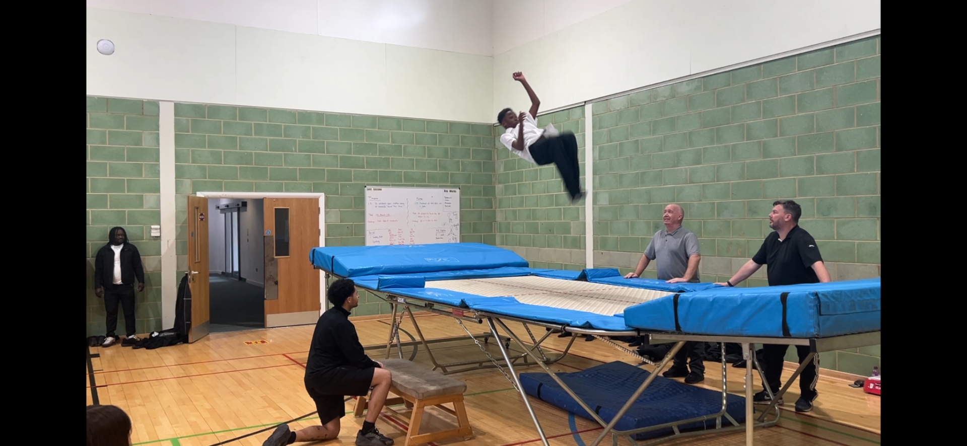 From the very first time the trampoline was introduced in a PE lesson, trampolining became an instant hit with the pupils. They have shown great enthusiasm in trying new moves, refining their skills, linking sequences, and creating their own routines. Trampolining has encouraged the boys to be brave, ambitious, creative, and focused in their approach. It has been particularly rewarding to see pupils supporting and coaching one another. Many showed a genuine desire for their peers to succeed, demonstrating leadership, compassion, and the ability to communicate clearly in order to help others improve. There was a real buzz of excitement in the lead-up to the trampoline display, which was performed in front of an audience of around thirty family members, friends, and teachers. While some performers appeared nervous and others excited, there was an unmistakable sense of pride in the room as the pupils performed and the audience watched. The display was a great success and a real privilege to be part of and witness.